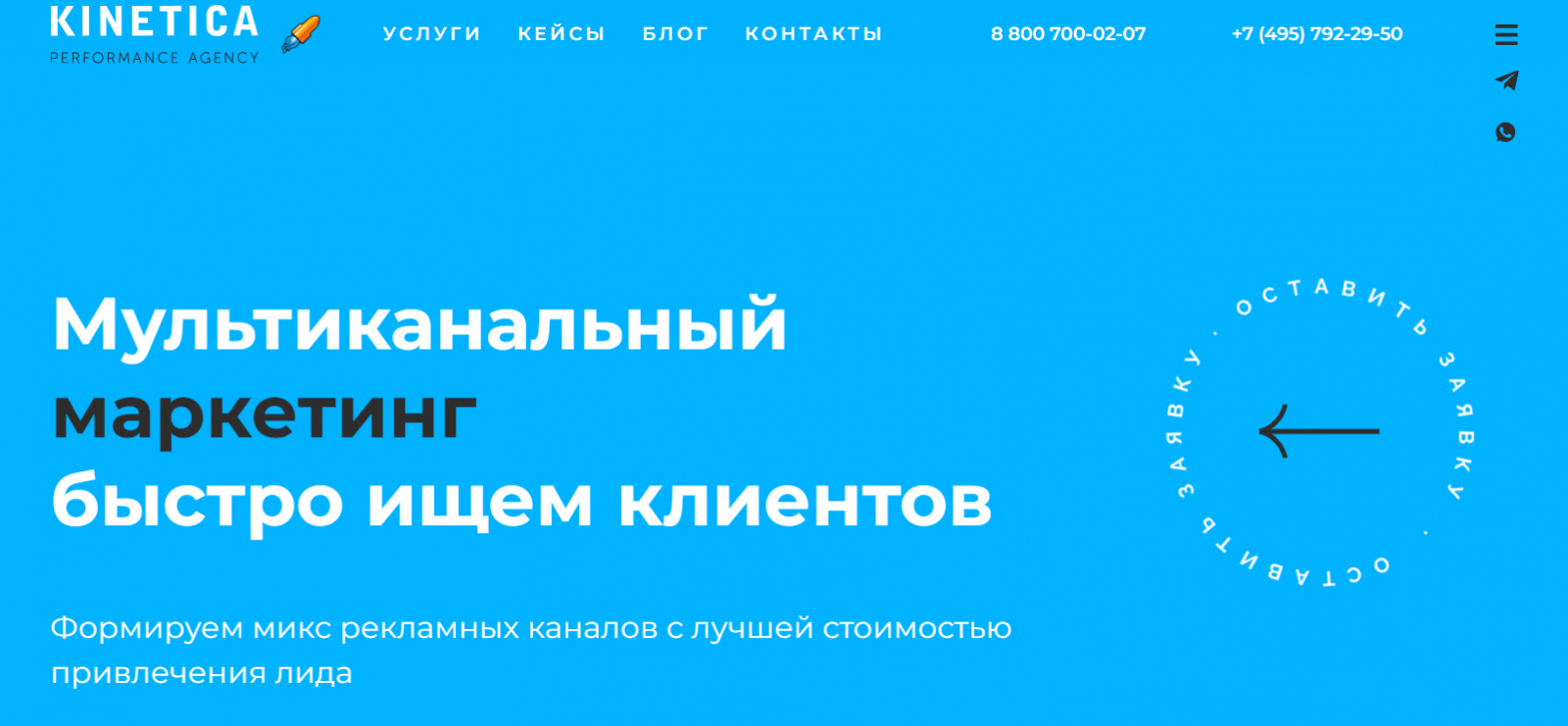 Агентство Kinetika работает около 16 лет и имеет в команде около 50 человек. Заявляют порядка 650 реализованных проектов. В наличии сертификаты от “Яндекса”, Google, VK. Ведут блог на сайте, делятся статьями на VC.ru, в TenChat, РБК.Pro, ведут Telegram-канал и подкасты про маркетинг. Выступают на RIW, TechWeek, “Потоке”.