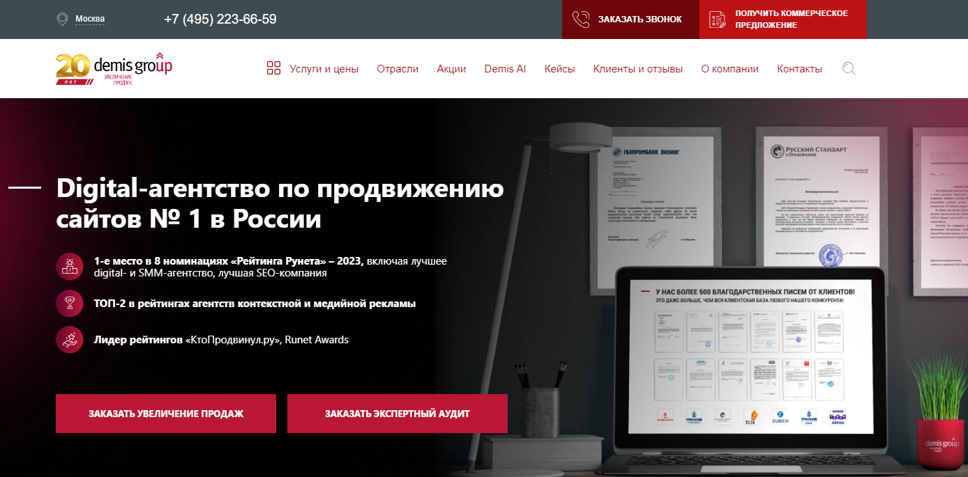 Агентство Demis Group оказывает широкий круг услуг и входит в топы рейтингов агентств контекстной и медийной рекламы. Прямо на сайте можно посмотреть условия, гарантии на услуги и размер неустойки. У агентства также есть своя собственная система лояльности, предполагающая скидки и дополнительные бесплатные услуги для участников программы привилегий.