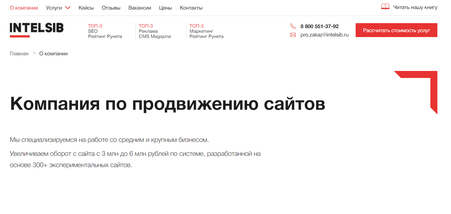 Агентство Intelsib занимается SEO с 2005 года и заявляет более 2300 реализованных проектов. Специализируется на продвижении среднего и крупного бизнеса. Компания входит в рейтинги по разным направлениям, а ее команда написали учебник по интернет-маркетингу, который, как утверждается, одобрен Министерством образования и науки РФ и является официальным пособием в 24 вузах страны.