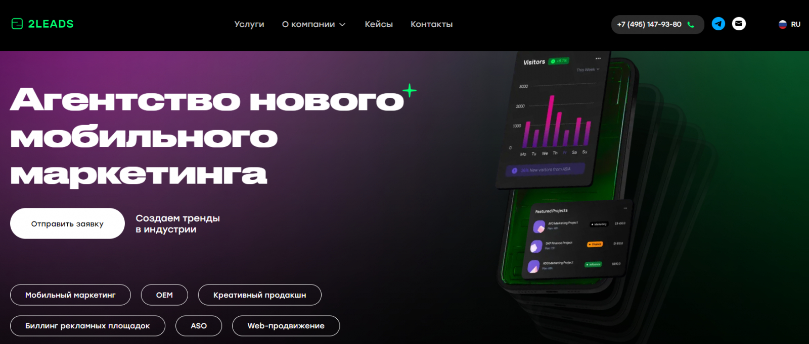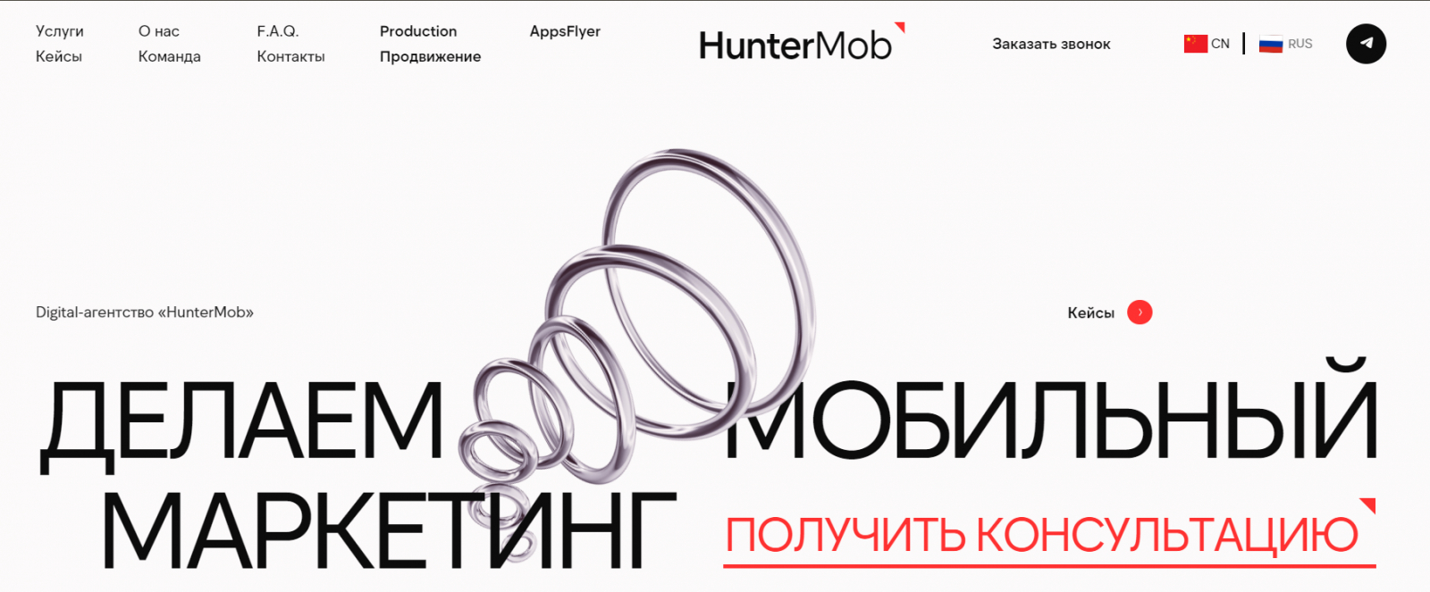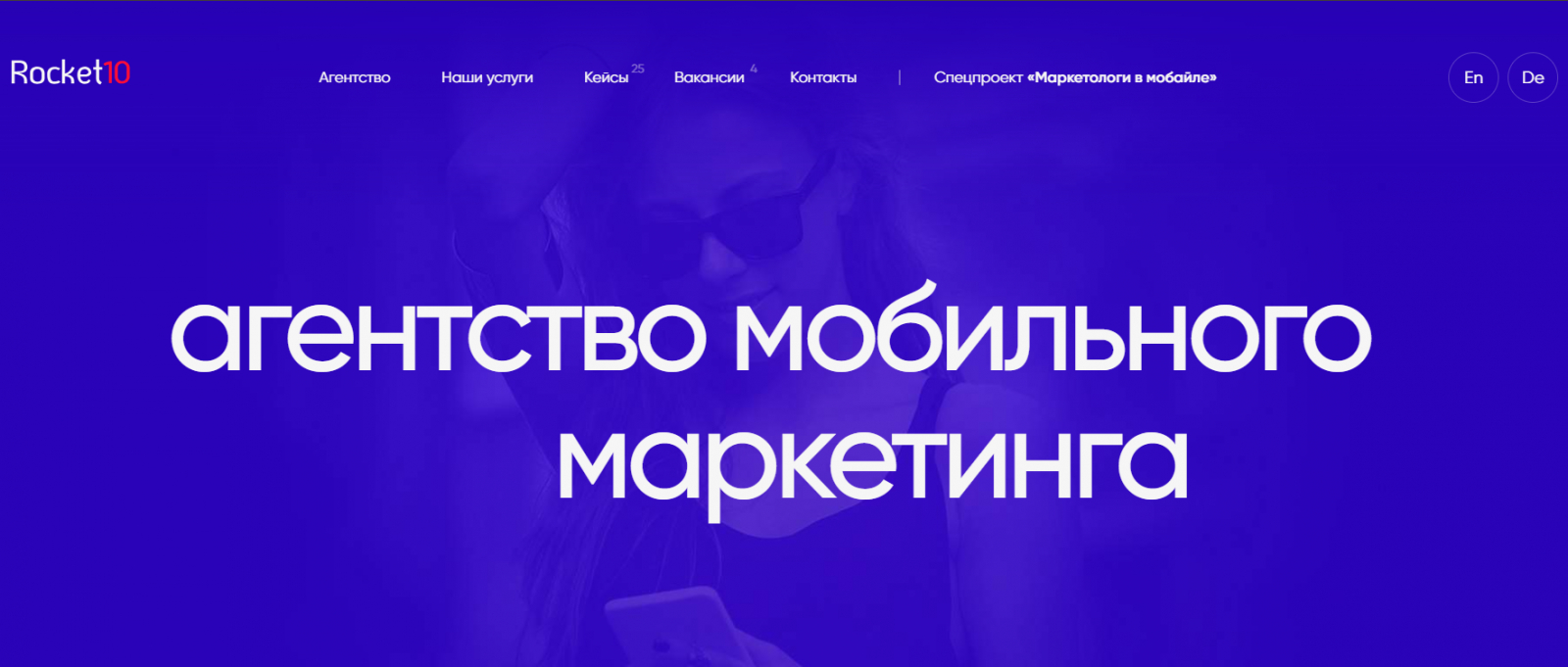 Агентство мобильного маркетинга. На рынке семь лет, заявляют около 400 кейсов. Сертифицированный партнер “Яндекса” и VK. На сайте также публикуются вакансии компании, что говорит о том, что компания заботится о своем HR-бренде и позиционирует себя не только как хороший исполнитель, но и как хороший работодатель.