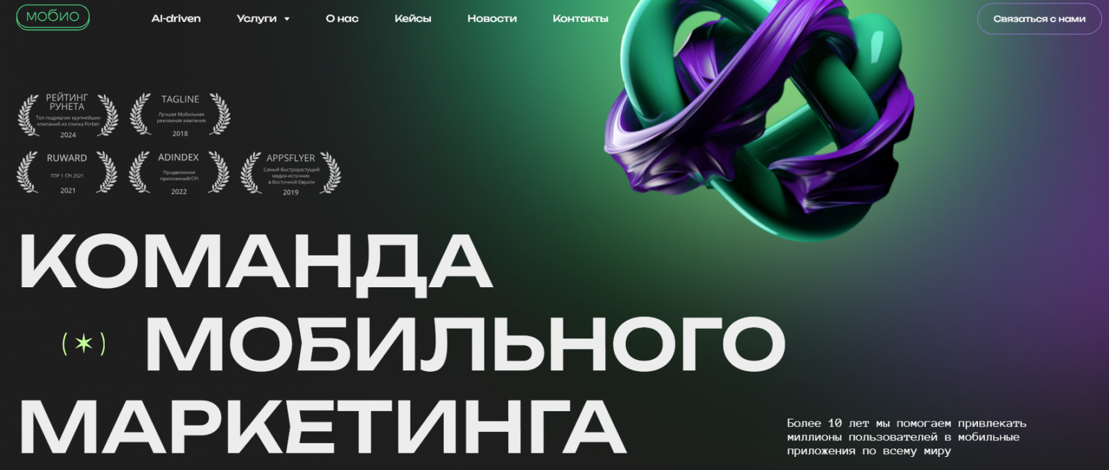 Агентство мобильного маркетинга “Мобио” работает около 10 лет, заявляет более 800 клиентов и 60+ миллионов скачиваний. На сайте можно найти множество наград и впечатляющих цифр. У “Мобио” есть собственная академия, где команда делится своей экспертизой через гайды, статьи, видео и различные обзоры, как на сайте, так и на сторонних медиа и в социальных сетях.