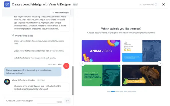 Visme может генерировать больше 100 типов проектов: презентации, инфографику, постеры, иллюстрации для соцсетей и так далее. ИИ-алгоритмы создают черновик, который затем легко настроить под свой вкус. Можно выбрать один из шаблонов, чтобы ускорить работу. Интерфейс понятный — удобно перетаскивать элементы. В промте для Visme нужно указать стиль изображений: фотографии, иллюстрации, 3D-графика. Генерация занимает до двух минут.