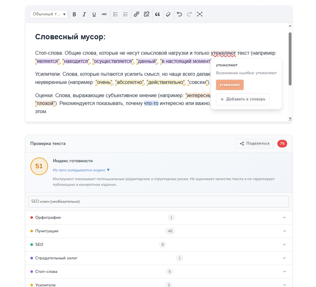 В панели ошибок есть поле для ввода SEO-ключа. Если указать ключевое слово, редактор проверит его распределение по тексту и предупредит о переспаме (более 3% от объёма).