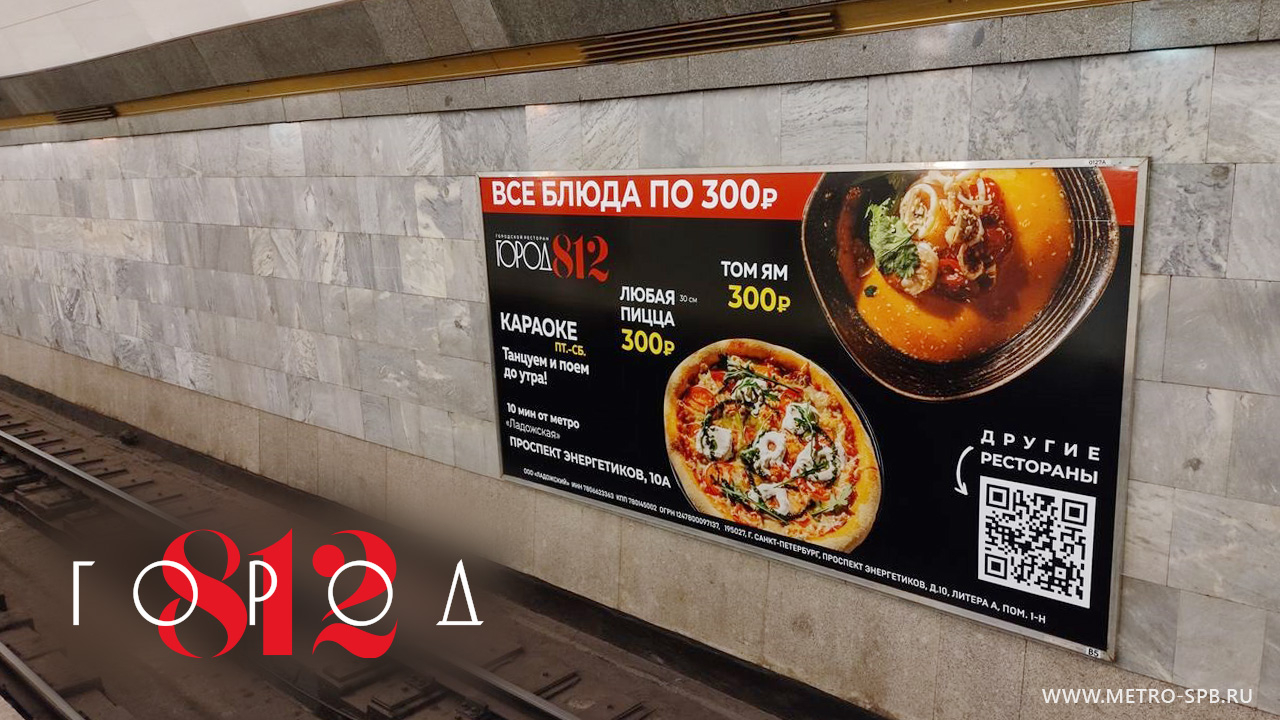 В апреле стартовала рекламная кампания сети городских ресторанов «Город 812» на путевых щитах 4,0×2,0 метра в метрополитене Санкт-Петербурга.