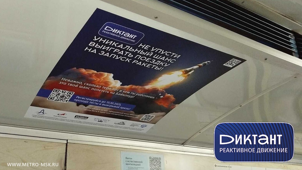 С середины сентября на Сокольнической линии московского метрополитена началось информирование о всероссийском диктанте «Реактивное движение». Размещение проходит на стикерах 45×50 см в вагонах.