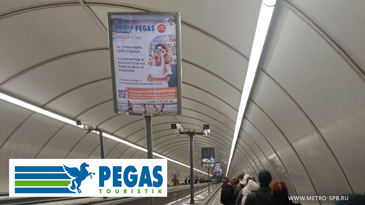 В декабре Рус Метро запустили рекламную кампанию для турагентства «PEGAS» на станции метро Выборгская.