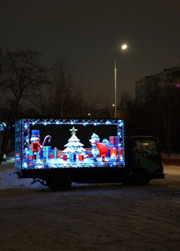 10 декабря 3 газели с видеороликами на фасадах проехали по Москве и отправились в Тверскую область, чтобы доставить новогодние подарки в детские дома и семейные центры. Когда машины останавливались, к ним подходила та самая массовая аудитория, на которую был нацелен проект. Люди хотели поближе рассмотреть анимацию, отсканировать QR-код и узнать, кто и что везет в таких запоминающихся машинах. А в потоке водители пропускали газели, чтобы посмотреть на енотов-воришек.