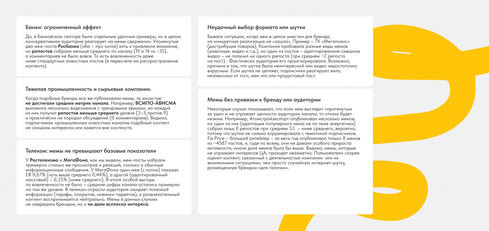 Менее популярные категории — брендовые мемы, мемы с актёрами бренда, а также мемы с узкоспециализированным юмором. Черный юмор, вызывающий неоднозначные реакции, в контенте практически не встречается.