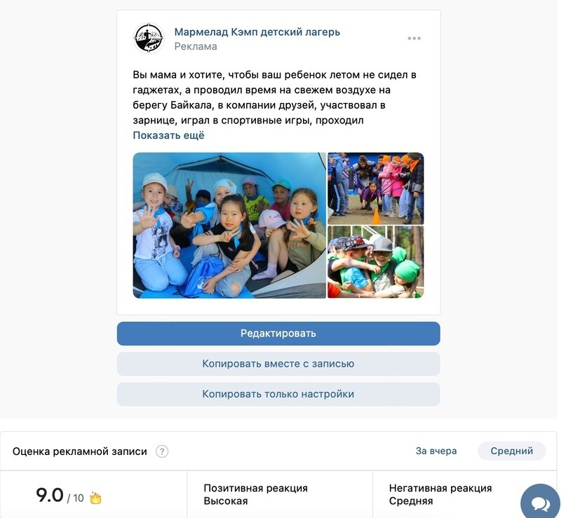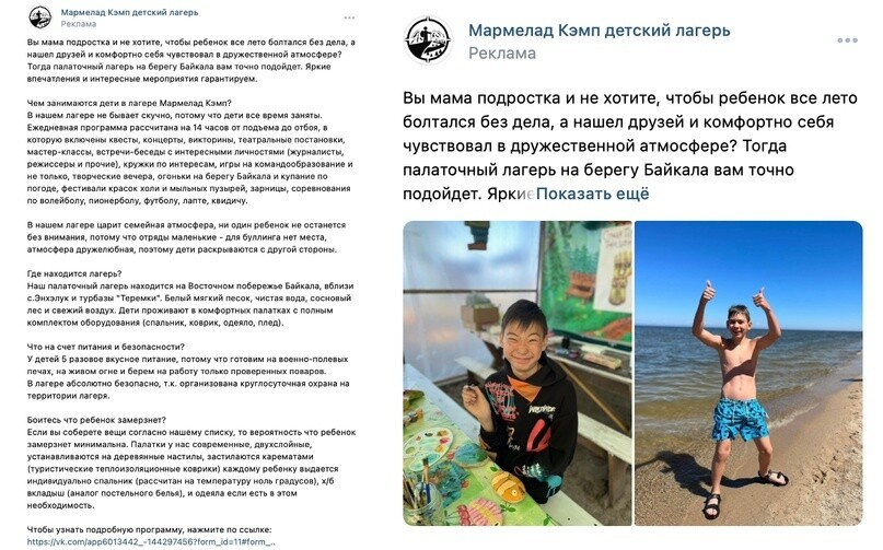 Лучше всего работали живые фото из лагеря, благо, что у клиента большое количество профессиональных фото и лайф фото жизни в лагере. В каждом объявлении было от 1 до 9 фото.
