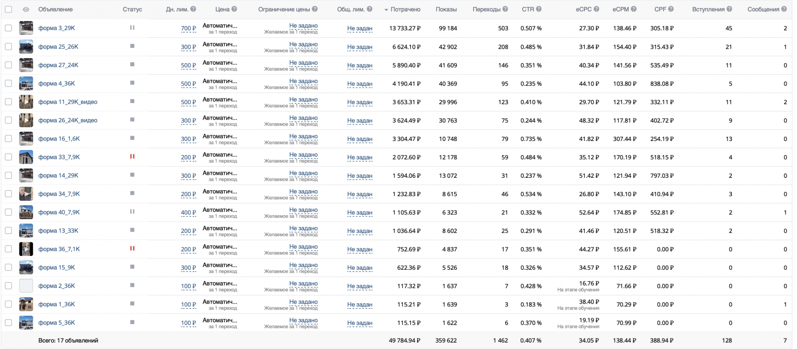 Также мы протестировали и видео крео в виде, но они давали хуже результаты, чем фото. Разговорные видео с собственником не принесли ни одной заявки.