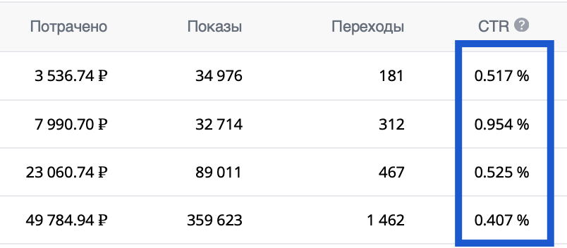 Кликабельность креативов на холодную аудиторию держалась в районе 0,5%, а на ретаргете 0,95%.
