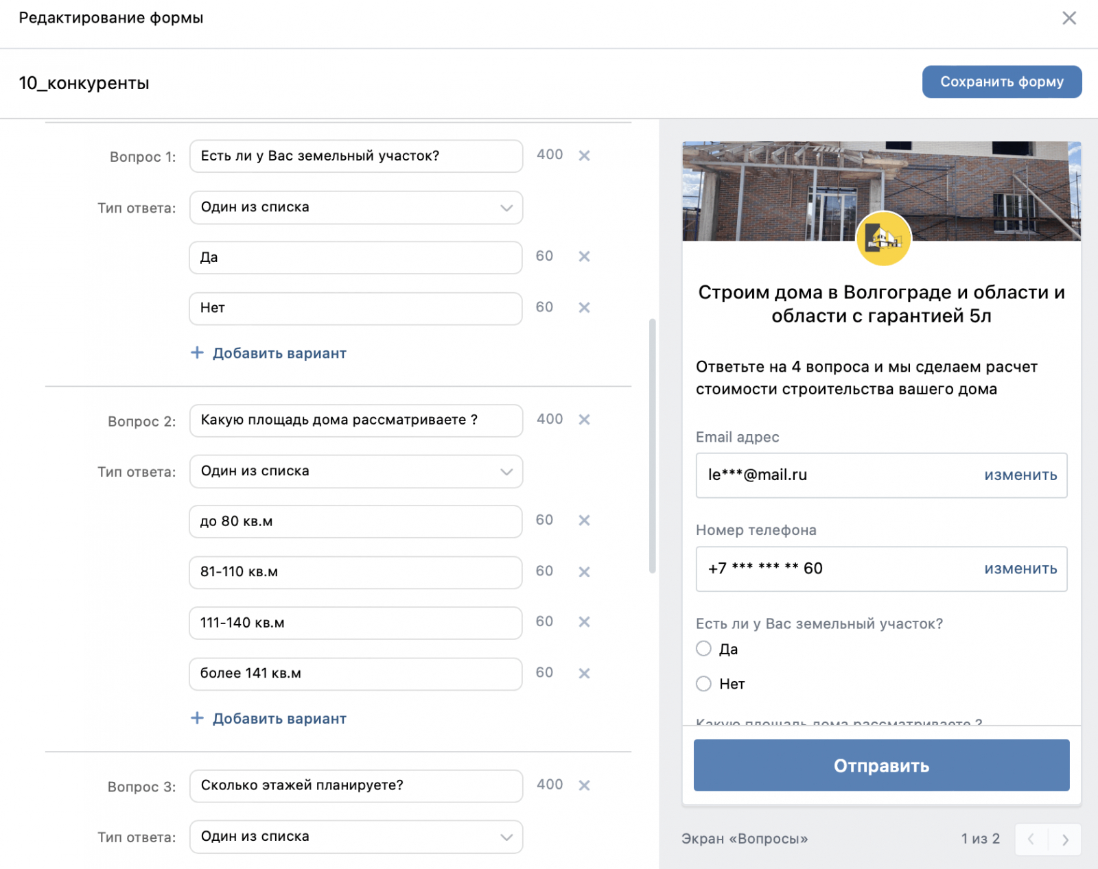 Квиз - рабочая тема в нише строительства, есть вариант сделать квиз с помощью приложения ВК или в специальном сервисе (например, марквиз). На начало проекта квиза не было, решили оставить эту гипотезу на 2-ой этап, если 1-я не сработает.