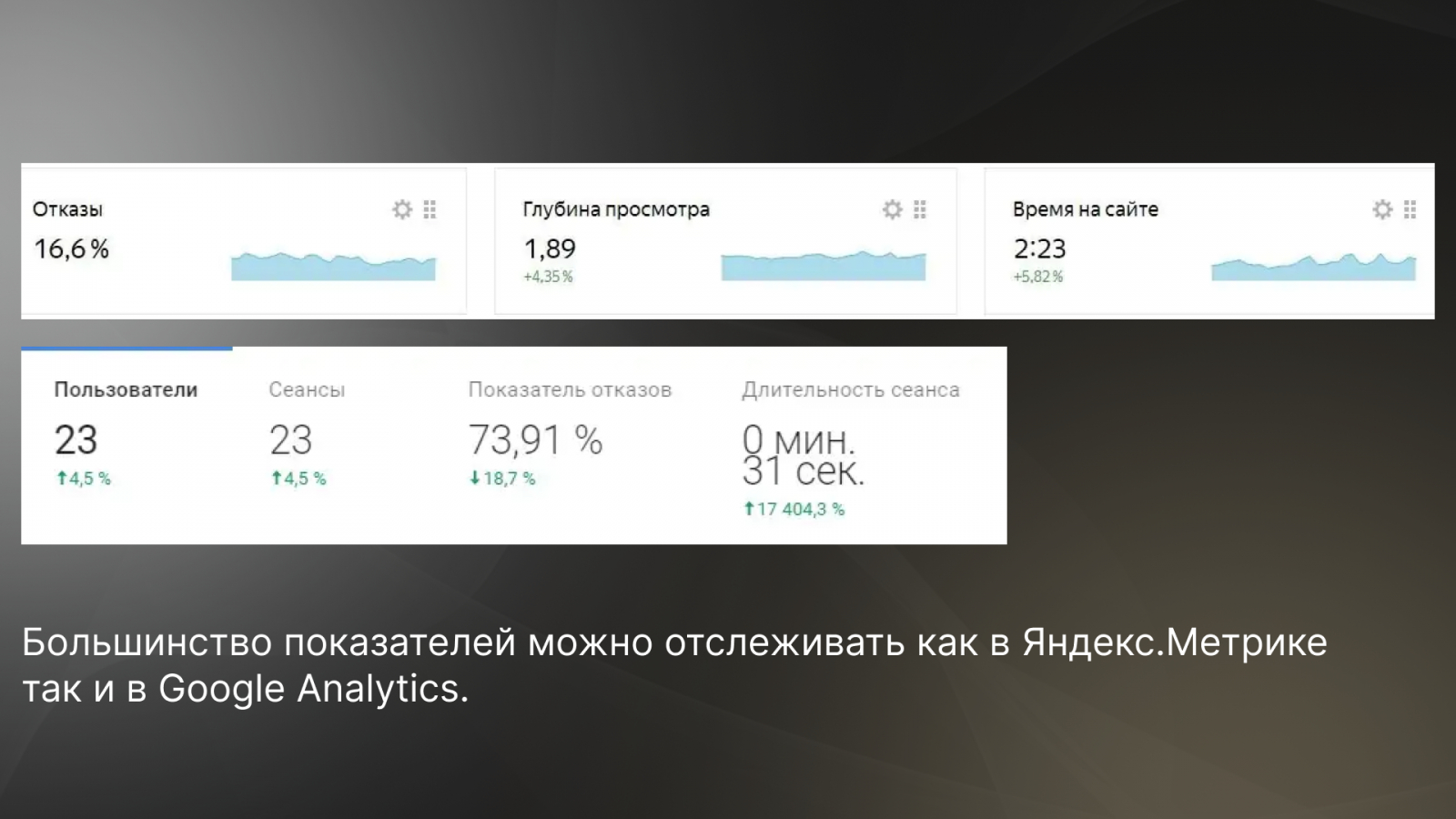 Также эти метрики называют поведенческими характеристиками. Так как они позволяют не просто считать посетителей, но и понимать их поведение. Например, если трафик растёт, но показатель отказов высокий, возможно, нужно пересмотреть посадочные страницы или содержание.