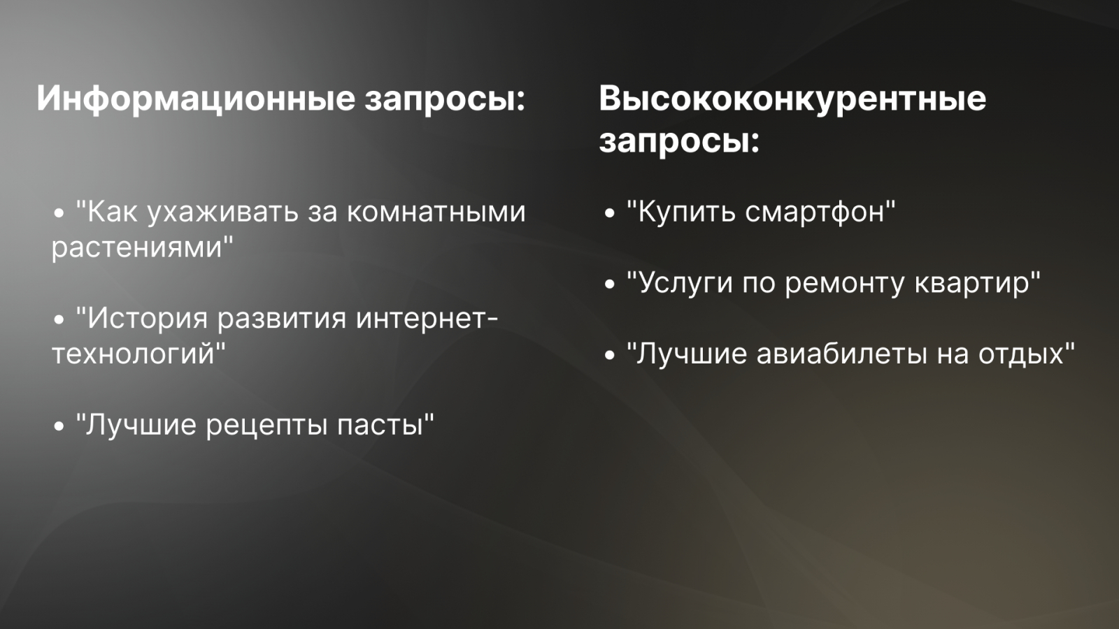 Высококонкурентные запросы — это те, которые имеют большое количество конкурирующих сайтов и контента. Обычно они связаны с коммерческими намерениями и могут привести к продажам. Например: