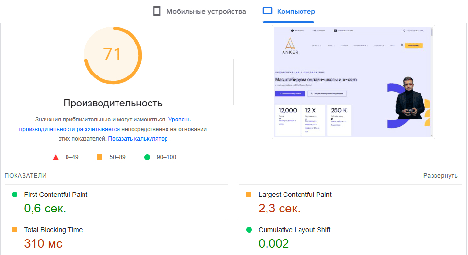 Через него можно определить скорость загрузки десктопной и мобильной версии сайта. Сервис проверит, как страница загружается у реальных пользователей, и даст рекомендации по ускорению. Хорошим считается результат в 90–100 баллов.