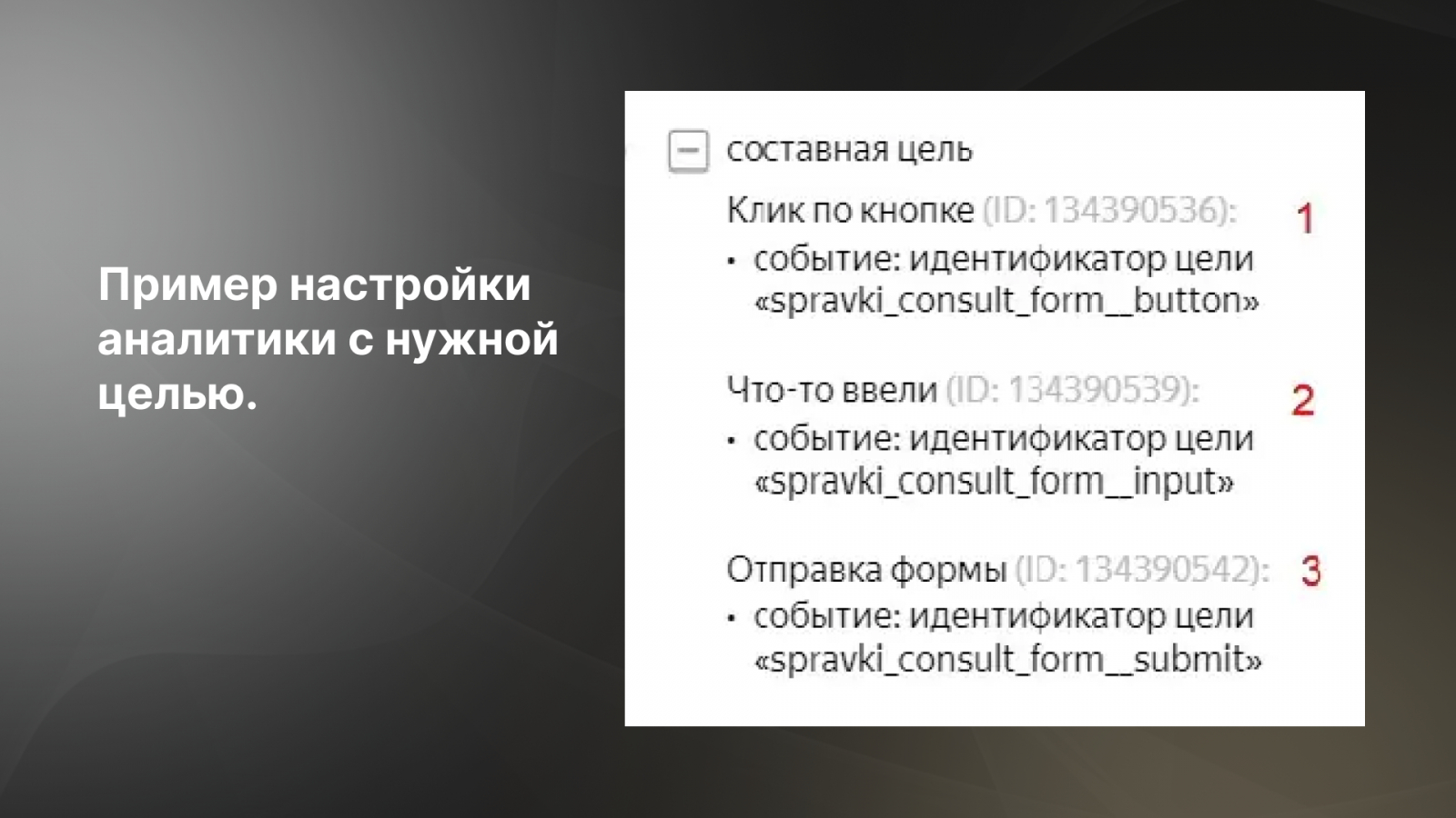 Важно учитывать всё, что приносит прямую или косвенную выгоду. Настройте отслеживание этих действий через системы аналитики. Еще лучше будет построение составных целей, где будет видно, на каком этапе действия пользователь бросил процесс: