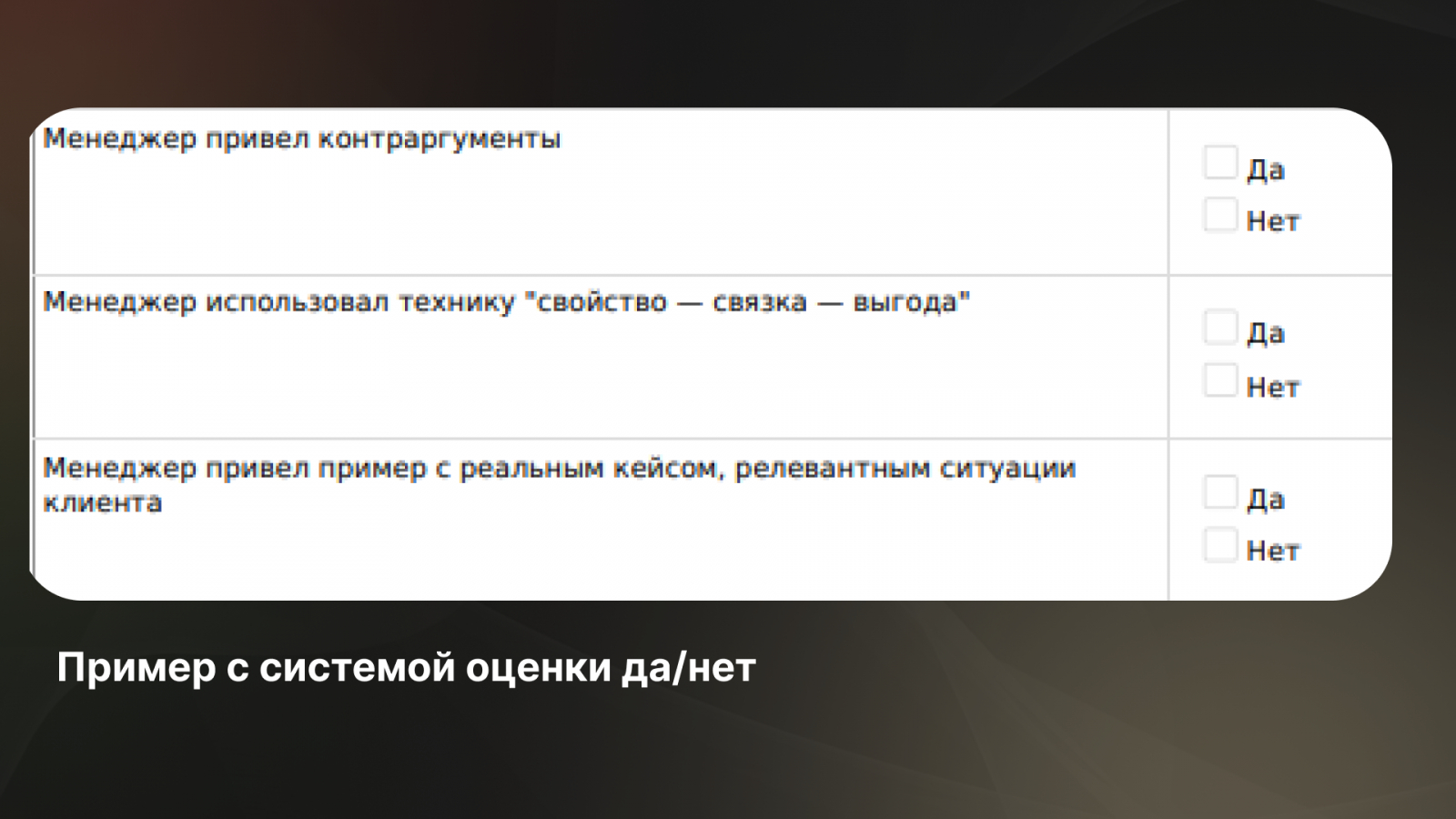1. Бинарный: отвечает «да» или «нет» на каждый пункт. За «да» менеджер получает 1 балл, за «нет» — 0.