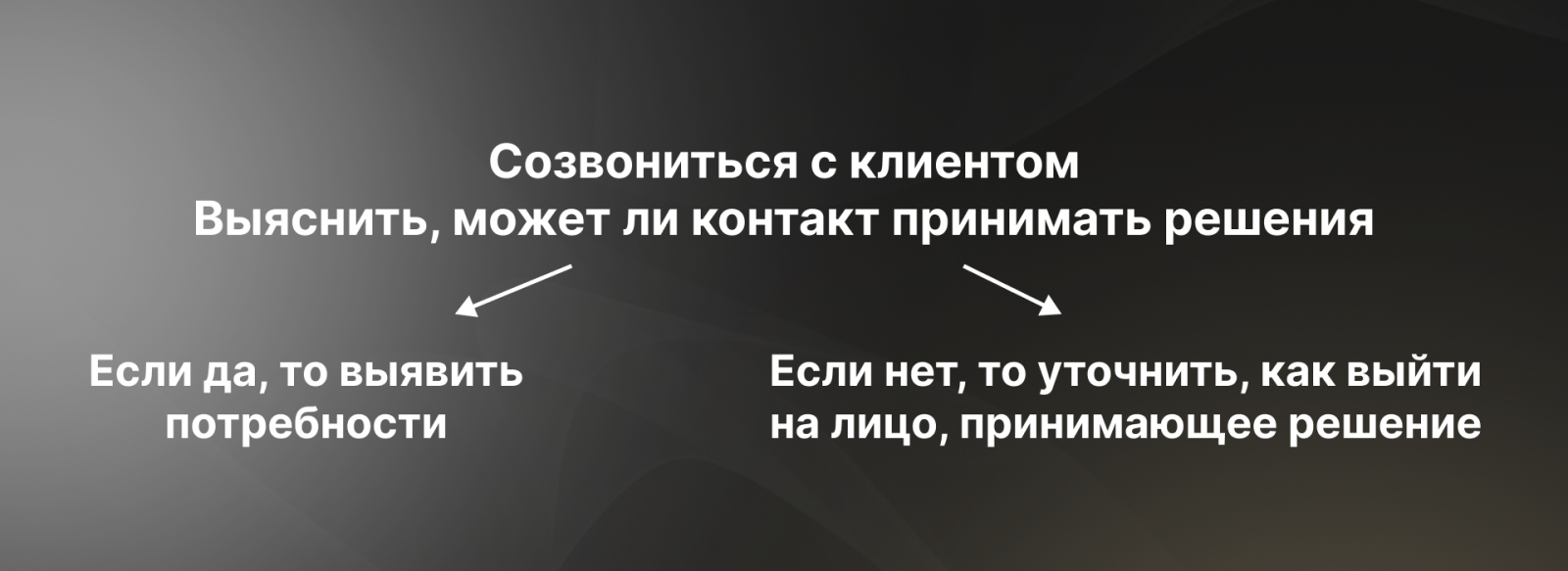 Такое разделение поможет менеджерам четко понимать, что именно нужно делать на каждом этапе. А тот, кто будет оценивать разговор, сможет делать это объективно.