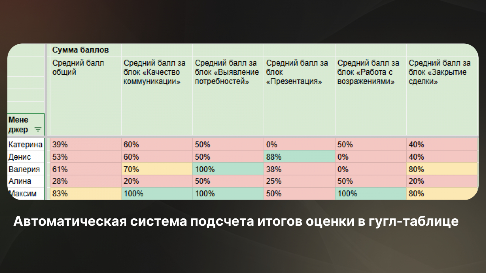 Это включает в себя формирование потребностей клиента, выявление его проблем и продвижение сделки. Если менеджер успешно справляется с этими задачами, это говорит о его прогрессе, и менее важные аспекты, такие как «забыл обратиться к собеседнику по имени», также будут улучшаться со временем.