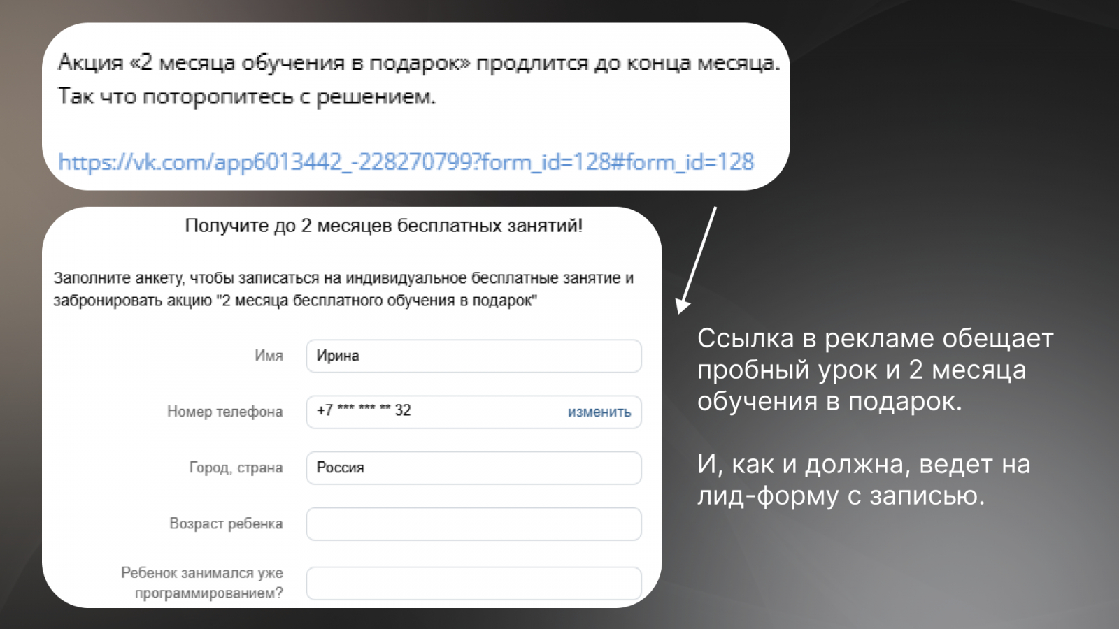 3. Логическая последовательность. Если человек увидел в рекламе предложение «Запишитесь на бесплатный урок», но по клику попадает на страницу с платными курсами без упоминания бесплатного урока – это вызовет раздражение и недоверие.