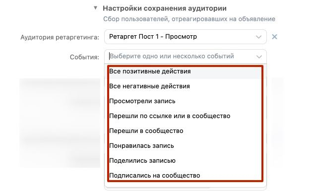 При работе с рекламой ВК всегда необходимо сохранять аудитории ретаргетинга в рекламных объявлениях. Действия можно отслеживать различные, начиная от «скрытия рекламы», заканчивая просмотром рекламной записи.