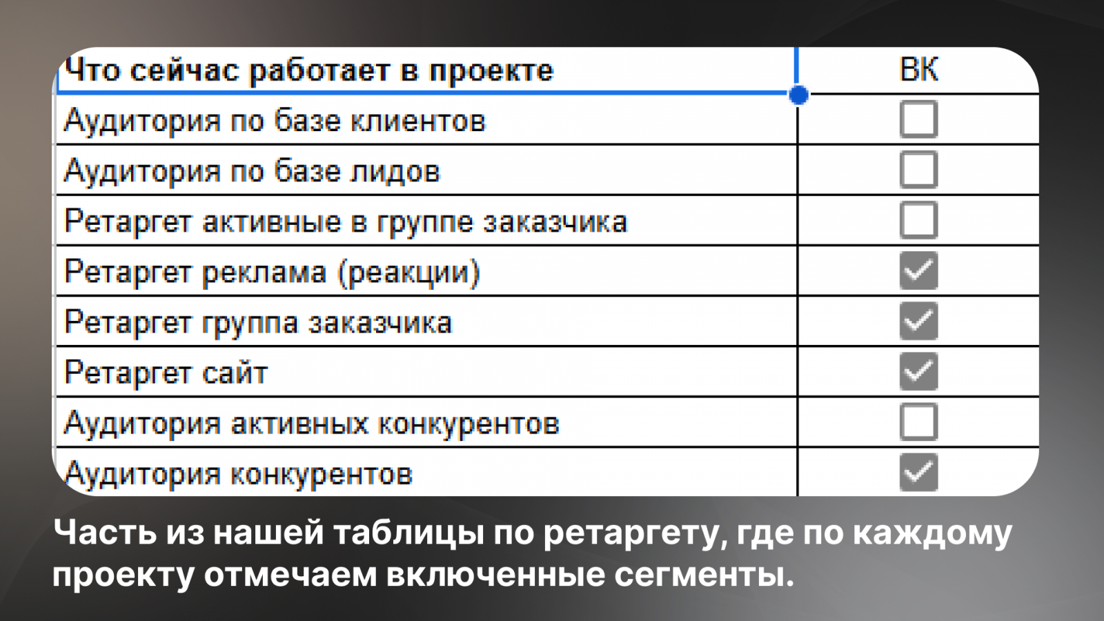 Кроме того, советуем активно работать с базой клиентов. Мы пользуемся таблицей ретаргета разных аудиторий. Где по каждому проекту отмечаем, что работает, а что нужно протестировать.