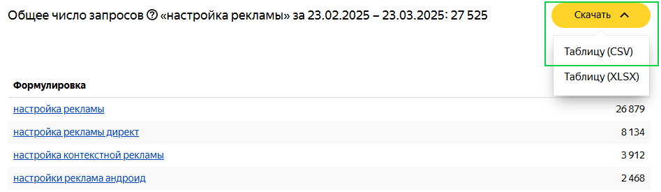 Вводим нашу фразу и получаем список популярных запросов. Тут же можно выгрузить их в Excel-таблицу: