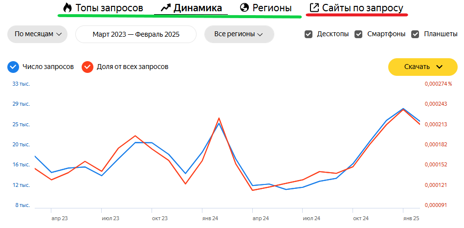 Также можно отследить динамику запроса, отсортировать результаты по словам и по регионам, а также по типу устройств: