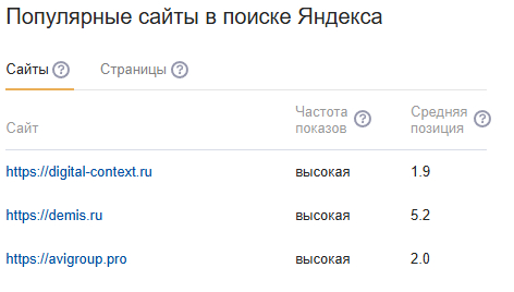 А если мы перейдем по кнопке Сайты по запросу, попадем в инструмент Яндекс. Вебмастер и найдем сайты конкурентов по этим фразам: