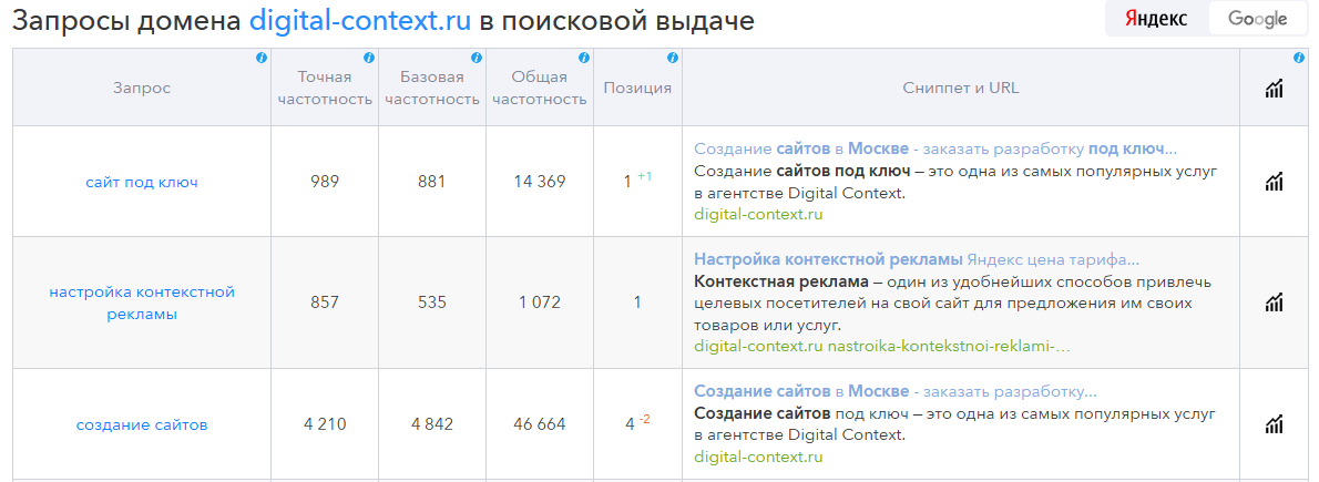 Видим, что конкурент лидирует по двум запросам – сайт под ключ и настройка контекстной рекламы.