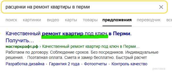 Используйте коммерческие запросы в рекламных объявлениях. Например, для рекламы ремонта квартир лучше подойдет «ремонт квартир под ключ цена» , а не «как сделать ремонт». Пример рекламного объявления в поиске: