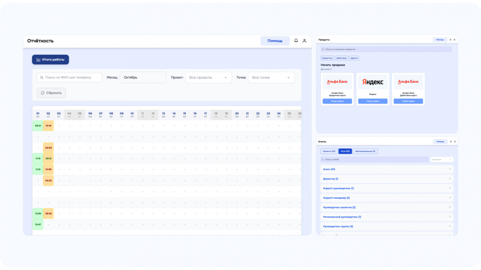 Формы подбираются под продукт и требования конкретного банка. Обязательные поля и проверки встроены, чтобы не возвращать клиента из-за опечатки или пропуска. Заявки фиксируются одинаково, статусы подтягиваются через интеграции: руководитель видит путь каждой сделки от первого касания до решения банка и может разложить воронку по локациям, сменам и агентам.