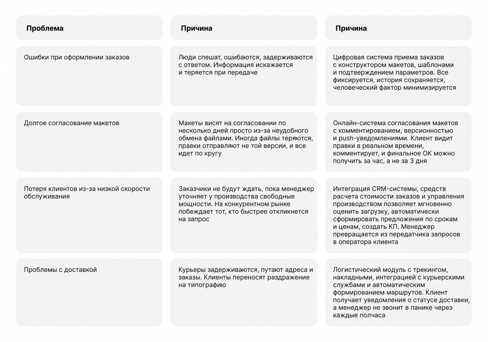 Автоматизация не решает все проблемы, но она убирает из уравнения человеческий фактор — там, где он не нужен. Ниже — конкретные боли, с которыми сталкивается каждая типография, и решения, которые эти боли снимают.
