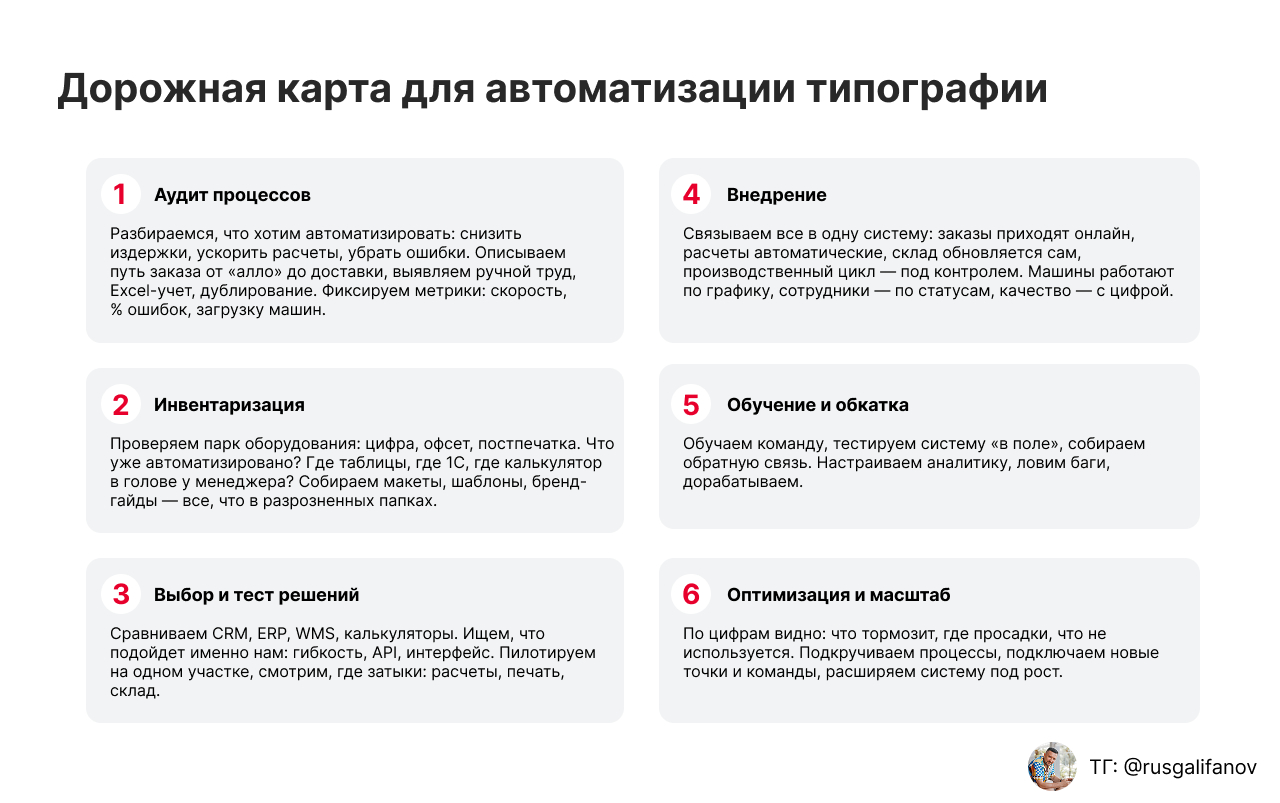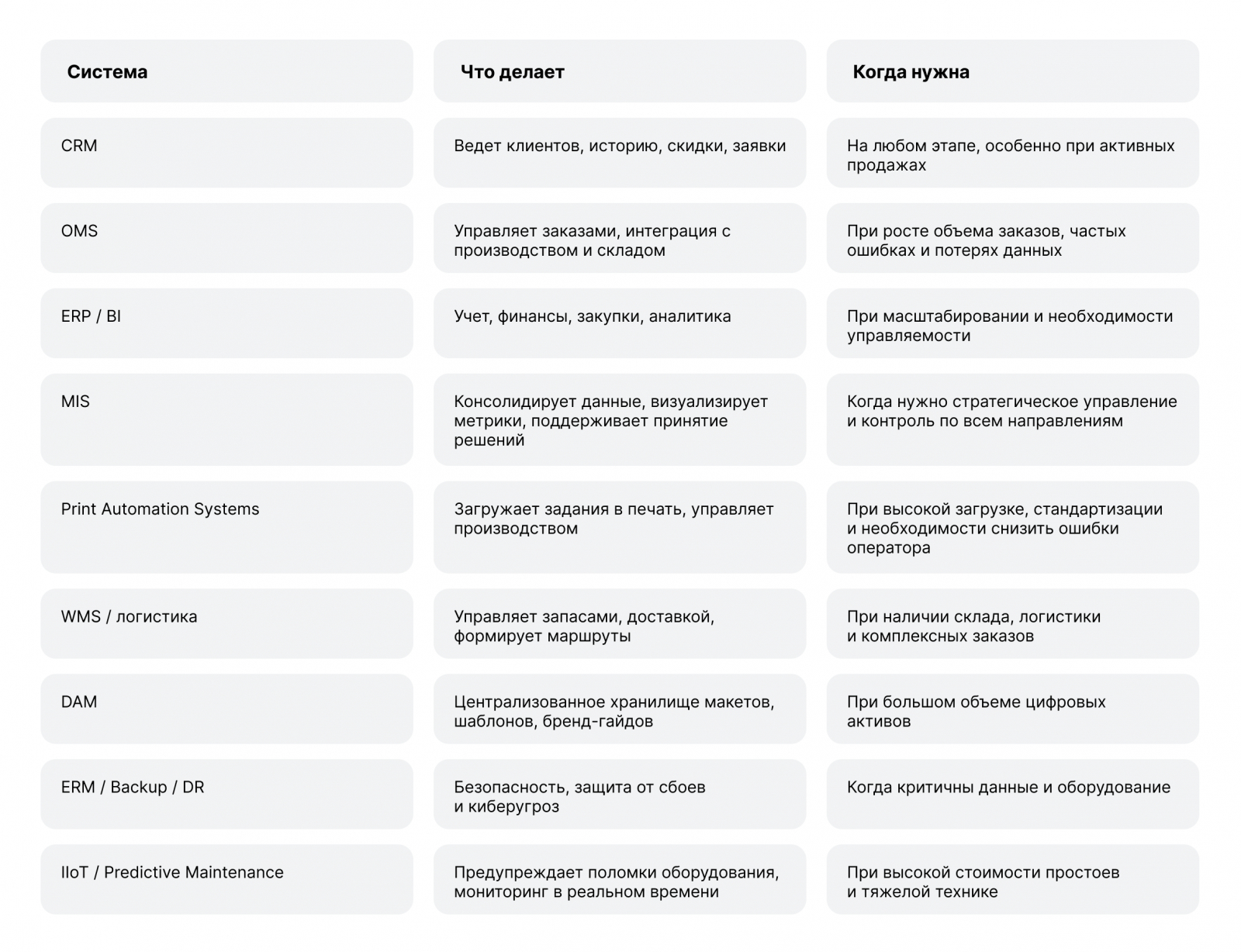 Собрал основные блоки IT-инфраструктуры типографии — от CRM до систем управления производством и логистики. Некоторые можно внедрять по отдельности, но лучший результат достигается, когда они работают в связке.