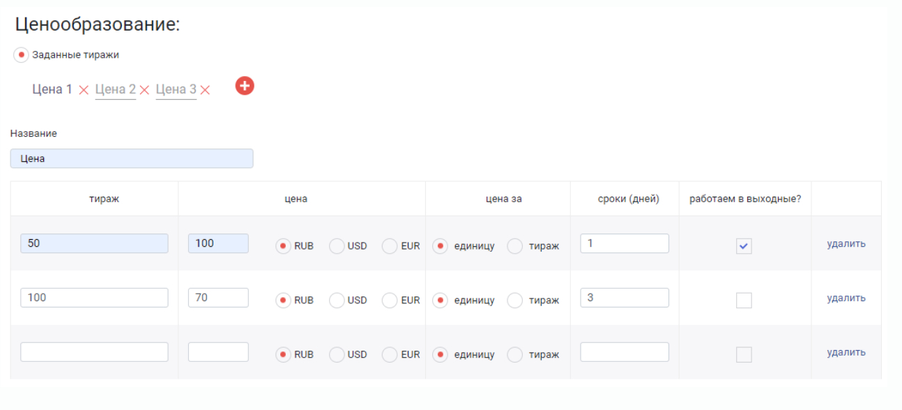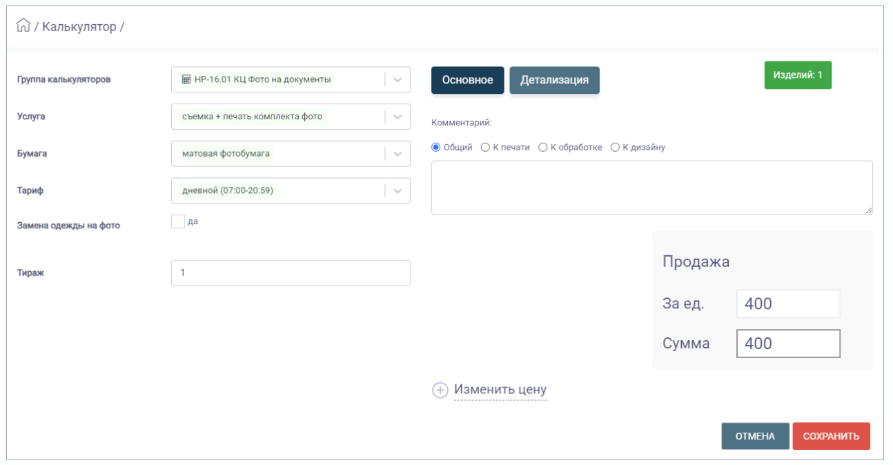Автоматически дает расчет в одном окне. В системе доступны специализированные калькуляторы для разных типов продукции: упаковка, широкоформатная печать и т. д.