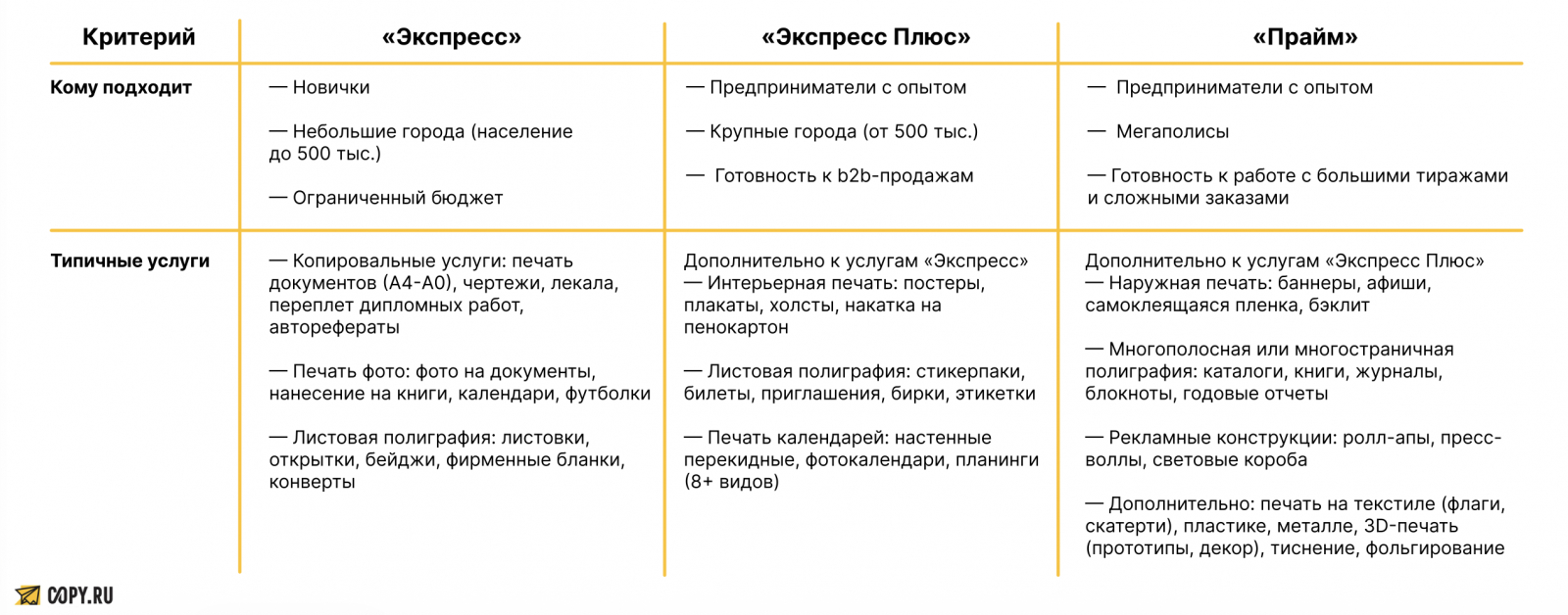 Copy.ru ассоциируется с надежной полиграфией (визитки, баннеры, сувенирка) и высоким сервисом. В мегаполисах и регионах бренд привлекает b2b-клиентов (HoReCa, форумы) и физлиц, обеспечивая партнерам готовый поток заказов.