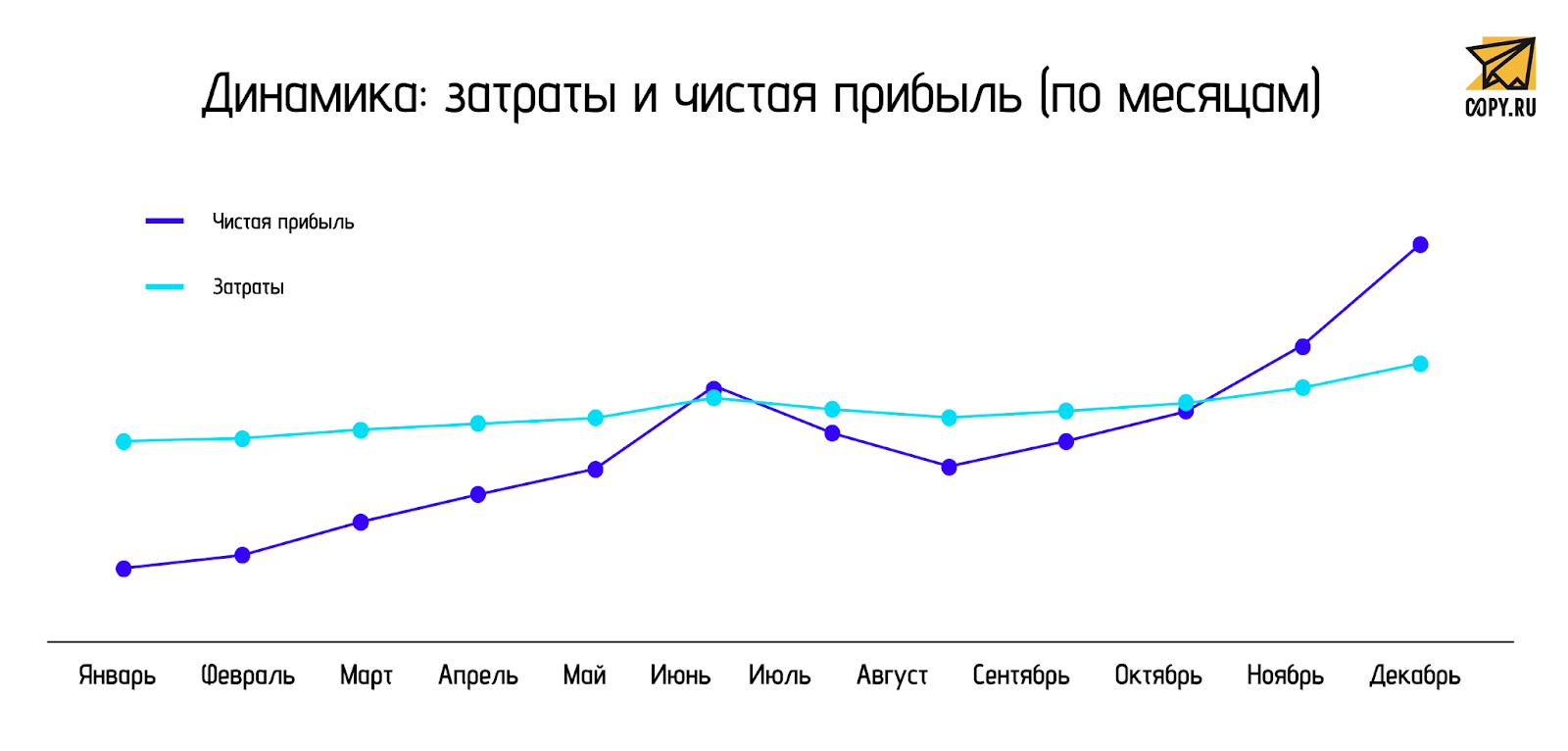 В первый год проект проходит стартовую «яму». Фиксированные расходы идут сразу, а выручка растет по мере набора трафика и повторных заказов. Поэтому в начале прибыль отрицательная. К середине года разрыв между выручкой и затратами сокращается. В конце года срабатывает сезонность и эффект от настроенных процессов: чистая прибыль выходит в устойчивый плюс.