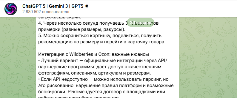 ChatGPT 5.2 - мощный универсальный помощник для текстов и диалогов. Но в экосистеме Telegram уже появились специализированные боты на базе ИИ, которые выполняют практические задачи, куда текст‑модель просто не лезет: озвучка, виртуальная примерка с Wildberries и Ozon, генерация коротких видео из текста и многое другое.