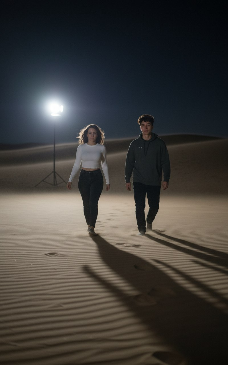 Пример промпта: «СТРОГО сохранить лицо, кожу, возраст, черты и пропорции 1:1 без любых изменений. Кинематографичный ночной кадр. Локация: пустыня с дюнами, бескрайний песок и далёкий горизонт; освещение: ночное, свет от прожектора светит на людей, тени; ракурс/кадрирование: полный рост двух человек в кадре, идут навстречу камере; поза: два человека идут рядом; стиль: фотореализм; глубина резкости: средняя, фон слегка размывается; фокусное расстояние: 50mm; детали: ветреная атмосфера; без посторонних объектов».