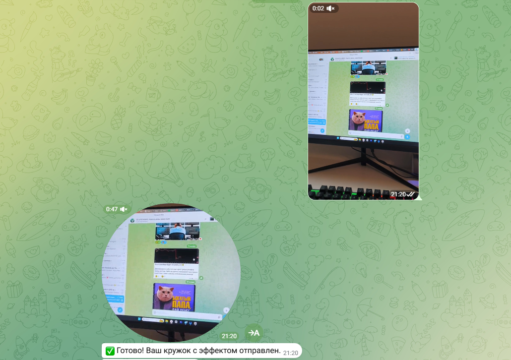 - Что умеет: Вы отправляете боту обычное горизонтальное или вертикальное видео, а он обрезает его в идеальный круг и конвертирует в формат «видеосообщения».