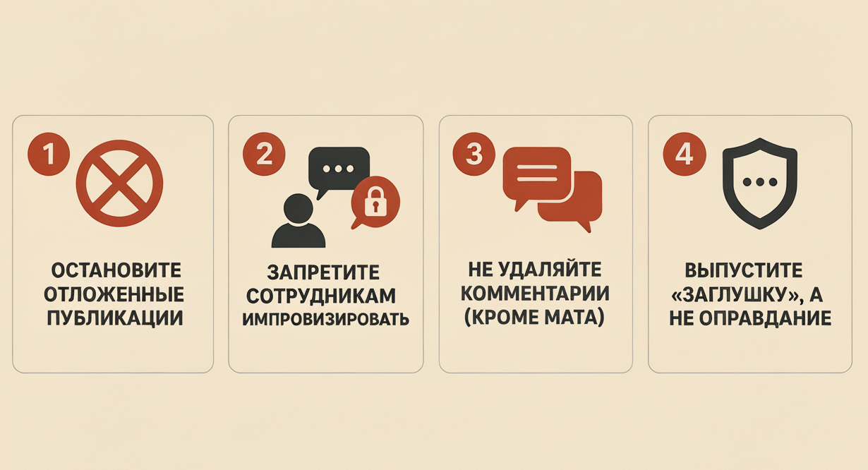 1. Остановите отложенные публикации. Самое глупое, что может случиться во время скандала — это выход веселого поста «С добрым утром!» или «У нас скидки!» на фоне всеобщего возмущения. Это выглядит так, будто вам все равно. Немедленно отключите весь запланированный контент во всех соцсетях.