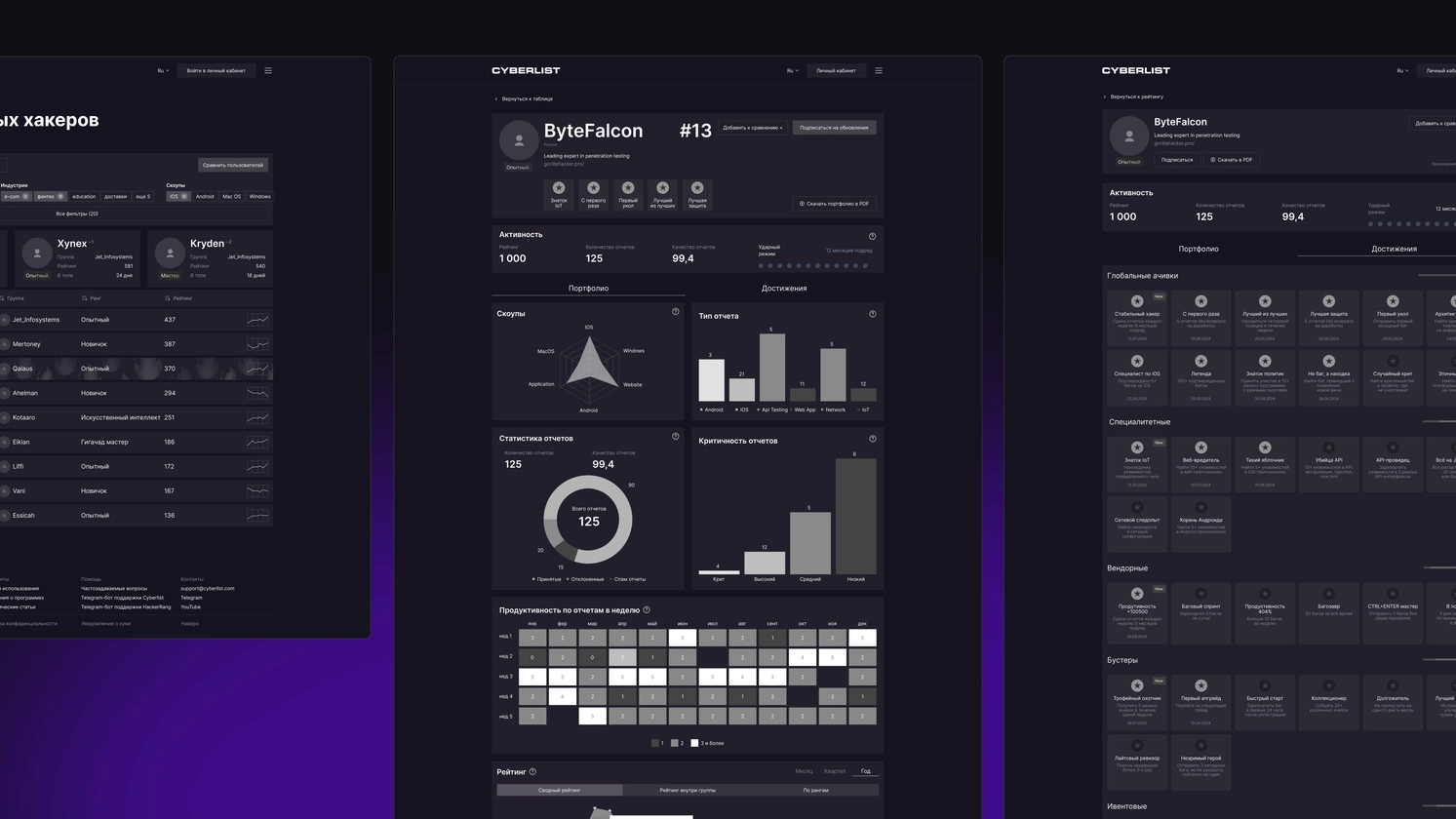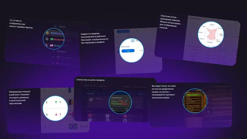 Смотрели не только багбаунти-сервисы, но и геймерские дашборды, киберспортивные трекеры и даже игровую статистику. Все — чтобы понять, как устроены рейтинги, как визуализируют прогресс и как управляют азартом, не превращая все в шоу.