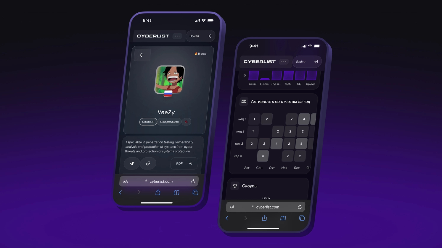 В целом мы старались сохранять чистоту — структура выстроена так, чтобы важное всегда было на виду, при этом не было лишнего шума. Профиль хакера задумывался как портфолио — чтобы им можно было гордиться, делиться и наблюдать свой рост.