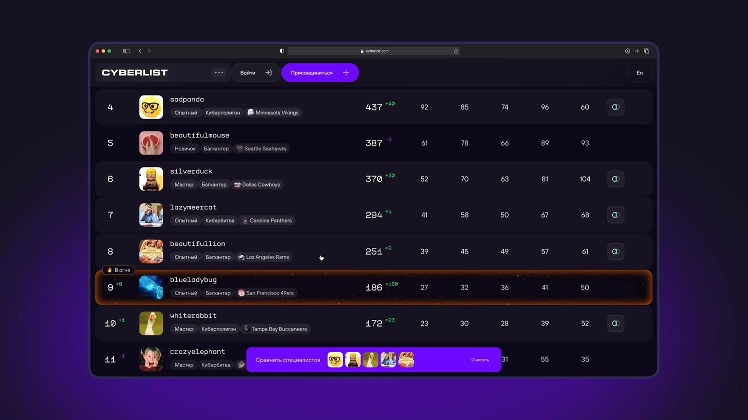 Но на этом не остановились. В рейтинг встроено сравнение хакеров по скиллам. Работает как корзина в маркетплейсах: добавляешь нескольких участников, и внизу экрана появляется «островок» — оттуда можно открыть сравнение.