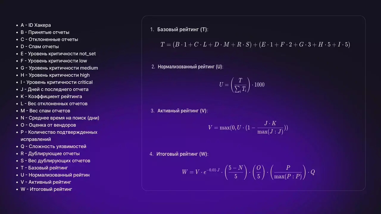 Коэффициент активности. Показывает, насколько регулярно хакер взаимодействует с платформой. Если долго нет новых отчетов, коэффициент постепенно снижается по экспоненте: