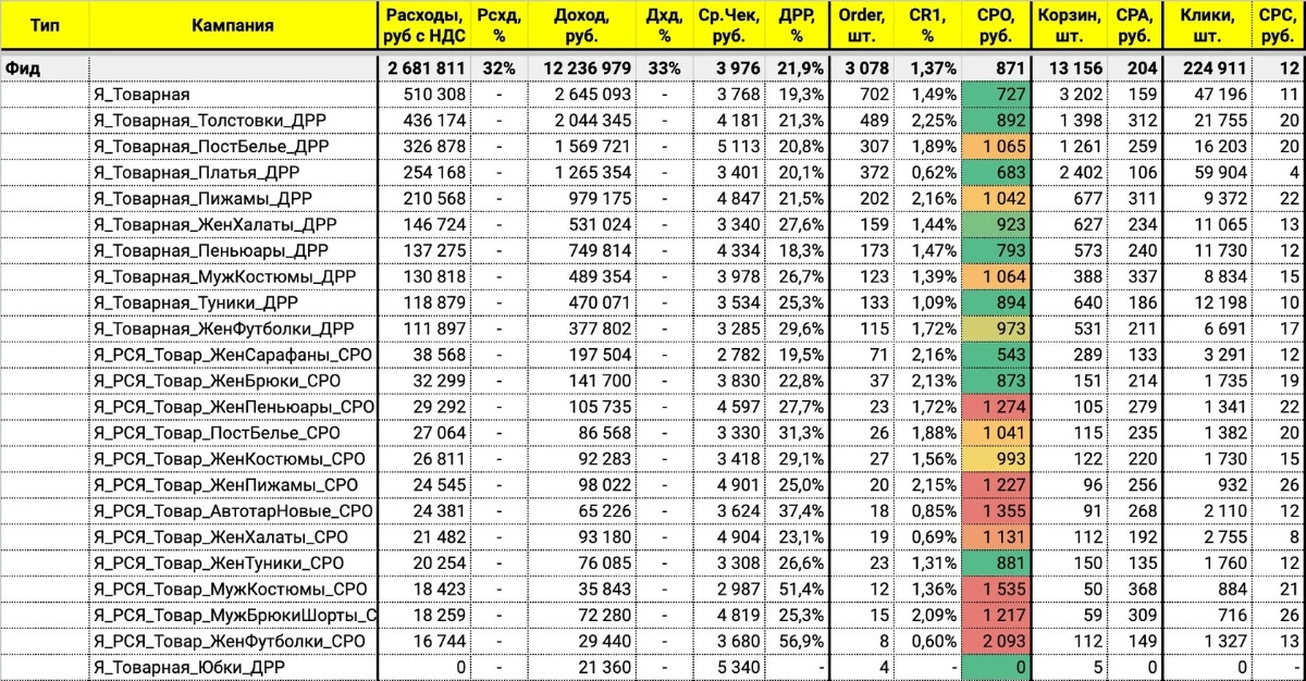 CPO на 30% выше среднего - Товарные кампании по фидам существенно недооценены,