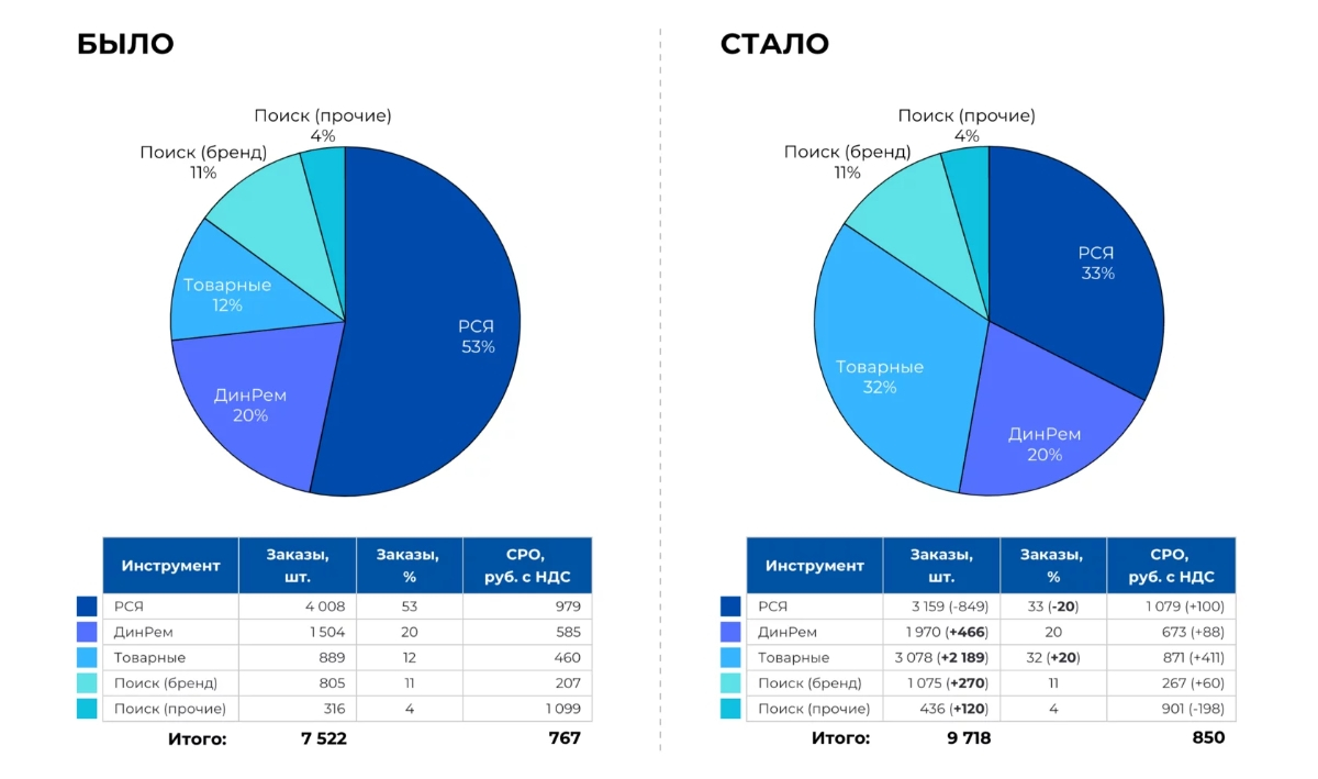 Предполагала как перераспределение бюджетов между инструментами, так и существенную доработку структуру рекламного кабинета и самих кампаний.