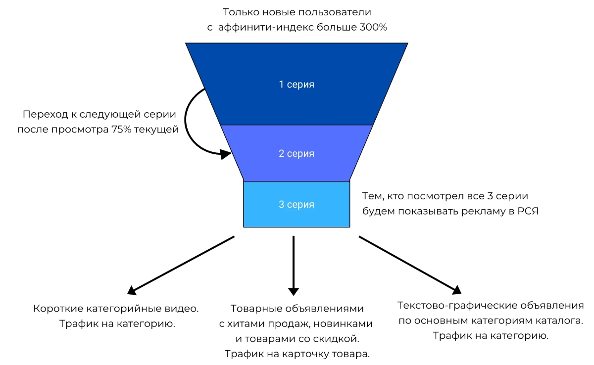 Для достижения этой цели будем наполнять верхний уровень воронки продаж за счет медийной рекламы в Яндекс Директ. Реклама будте в виде мини-сериал из 3х серий по 20 секунд.