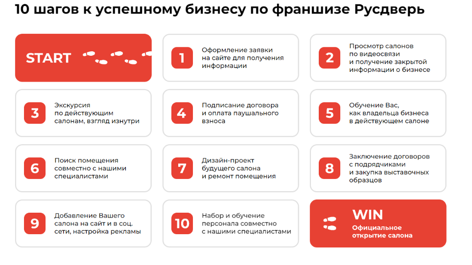При открытии бизнеса по франшизе "Русдверь" франчайзер обеспечивает не только начальное обучение, но и поддержку на всех этапах — от выбора локации до привлечения клиентов. Это особенно важно для тех, кто впервые сталкивается с управлением собственным делом. Партнеры франшизы получают готовую систему маркетинга, проверенные каналы поставок и инструменты для управления продажами.
