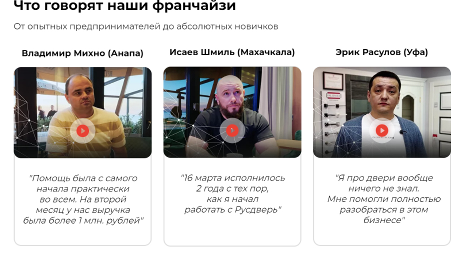 "Русдверь" — это не просто франшиза, это сообщество успешных предпринимателей. Многие из тех, кто когда-то начал с нуля, сейчас имеют собственные сети магазинов и зарабатывают миллионы. Франшиза помогает обычным людям, которые ранее не имели опыта в бизнесе, добиться финансовой независимости.